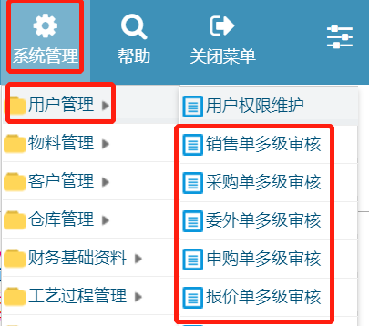1. 进入ERP系统后,在“系统管理-->用户管理”,选择某一订单类型设置多级审核功能,点击进入