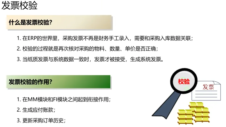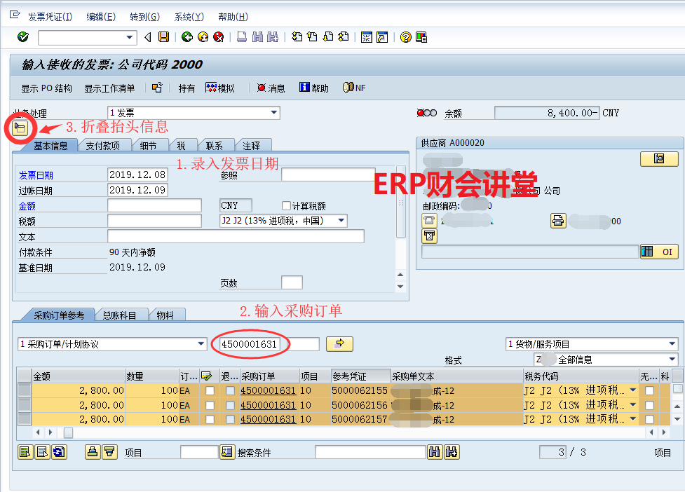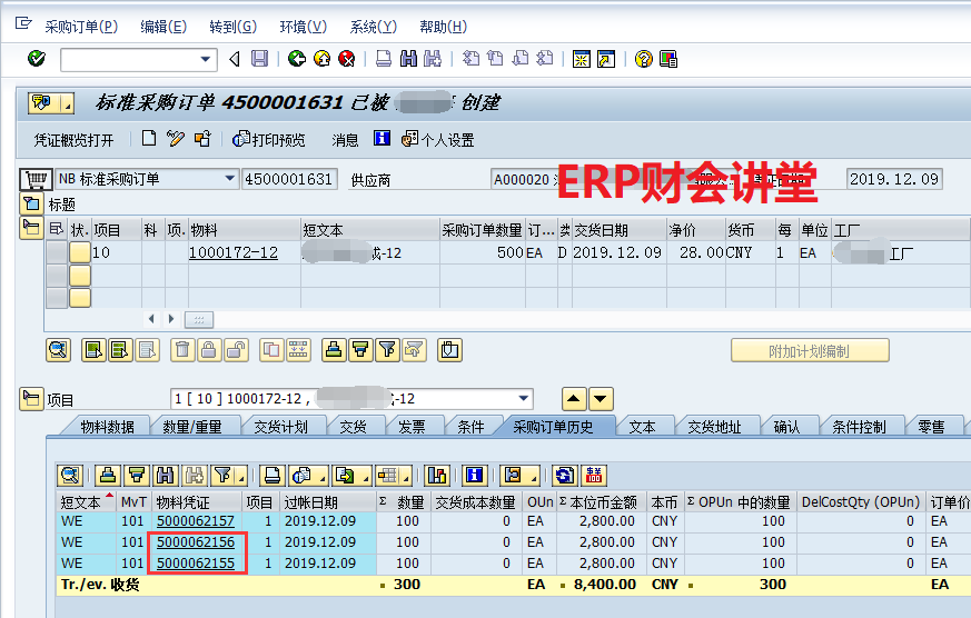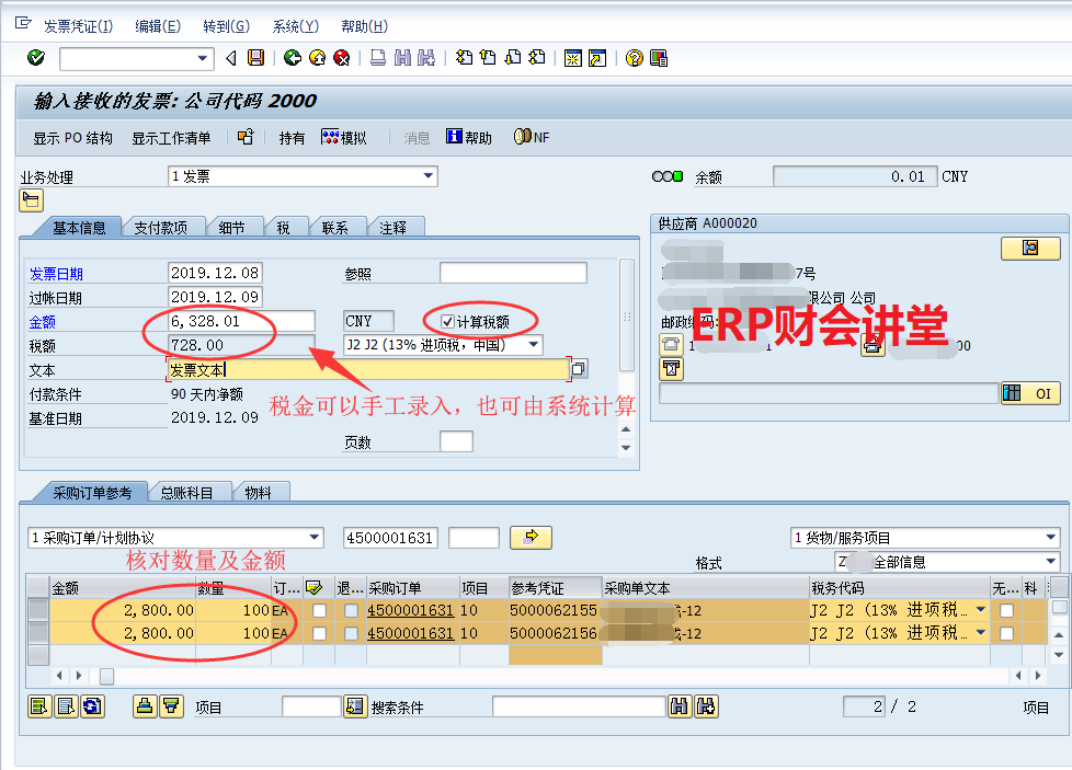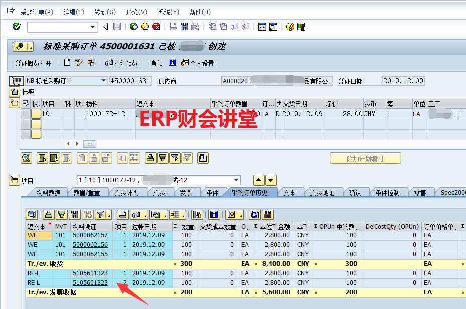 发票校验是SAP采购流程中的重要环节,收到供应商发票之后,需要在SAP中匹配入库记录,并核对数量和金额是否正确,如有差异需要进一步确认原因,必要时将发票退回给供应商。 SAP中发票校验可以通过事务码MIRO由财务一步处理,也可以先由业务预制发票(MIR7),然后财务审核过账发票(MIR4)。本文以MIRO为例,介绍SAP中发票校验的具体操作。 系统中有如下采购订单,数量为500,订单收货3次,每次数量100,查看采购订单历史如下图。当前收到供应商发票,数量为200,接下来MIRO进行发票处理。 ![]() 第一步,匹配入库凭证。