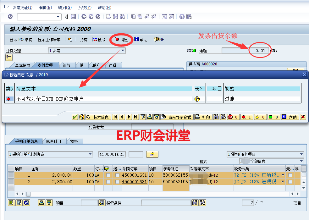 上图错误原因为发票的借/贷余额不为0,系统没有找到记录差异的科目。更改发票金额使借/贷余额相等,再次模拟,“消息”处不再提示错误。