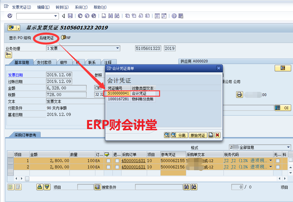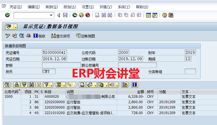 点击保存按钮生成系统发票凭证。MIR4查看发票凭证如下图,