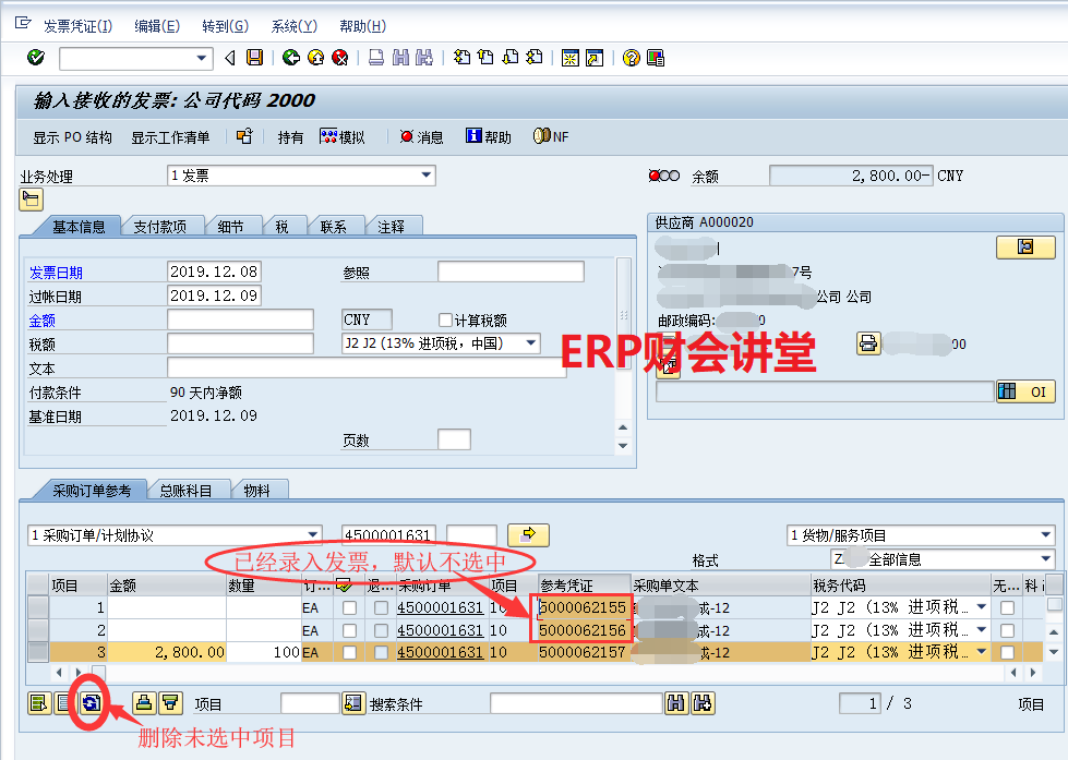 订单的入库数量为300,发票数量为200。并且再次对订单录入发票时,已经匹配发票的入库凭证默认未选中,可以直接点击右下角的图标删除项目。并且,通过后台配置,可以实现一张物料凭证只能匹配一次发票,防止重复的发票校验。
