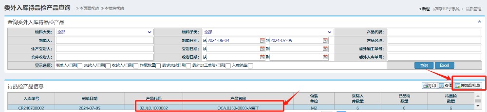 若在此界面查不到单据,则需要通知仓库进行第 如下图:选择对应的单据,点击”增加品检单“按钮;