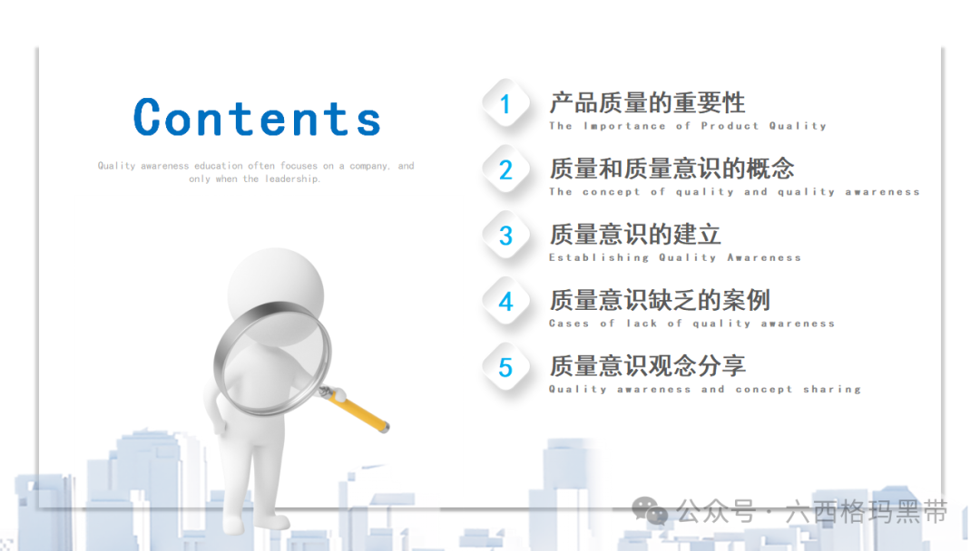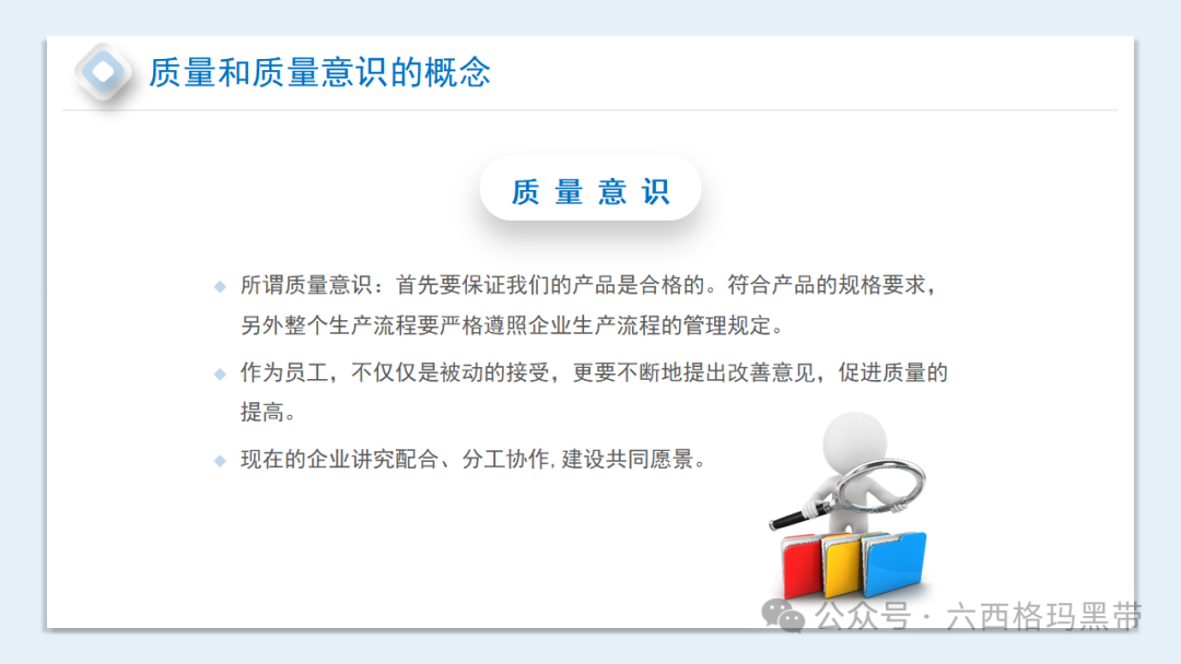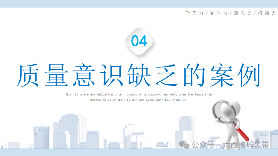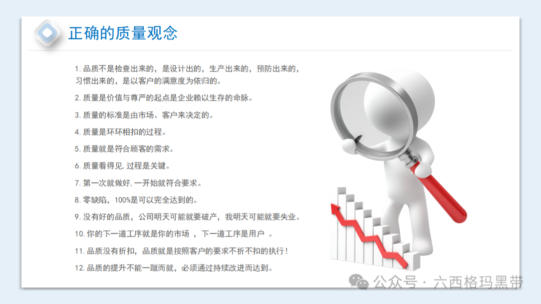 质量意识缺乏的案例让我们来看一些质量意识缺乏的案例。案例1、案例2、案例3、案例4和案例5,这些案例都反映了我们在工作中可能遇到的一些问题。比如,小小的错误被忽视,最终导致小事变大事;原物料屡屡领错,反映出我们的管理存在漏洞;对工作要求理解不清,盲目操作,等等。这些案例给我们敲响了警钟,我们必须从中吸取教训,避免类似问题的发生。 案例1:小小的错误被忽视在一个电子产品的生产线上,工人在装配过程中发现了一个小小的螺丝没有拧紧,但认为这是一个小问题,没有及时处理。结果,这个产品在客户使用过程中出现了故障,导致客户对我们的产品失去了信任。这个案例告诉我们,小小的错误如果不及时处理,可能会引发严重的后果。 案例2:原物料屡屡领错在另一个生产线上,工人多次领错了原材料,导致生产过程中断,延误了交货时间。经过调查发现,这是由于原材料管理混乱,标识不清导致的。这个案例反映了我们的管理存在漏洞,我们需要加强原材料管理,确保每一种原材料都有清晰的标识和严格的领用制度。 案例3:对工作要求理解不清在一个软件开发项目中,开发人员对客户需求理解不清,盲目开发,结果开发出的产品与客户的需求相差甚远,导致项目失败。这个案例告诉我们,我们必须与客户保持密切沟通,确保对客户需求有准确的理解,避免盲目操作。 质量意识观念分享在质量观念方面,我们常常存在一些错误的认识。比如,认为质量是各人自扫门前雪,莫管他人瓦上霜;认为质量差不多就可以了;认为质量只牵涉到有形的事务,等等。然而,正确的质量观念应该是:品质不是检查出来的,是设计出的,生产出来的,预防出来的,习惯出来的,是以客户的满意度为依归的;质量是价值与尊严的起点,是企业赖以生存的命脉;质量的标准是由市场、客户来决定的;质量是环环相扣的过程;质量就是符合顾客的需求;质量看得见,过程是关键;第一次就做好,一开始就符合要求;零缺陷,100%是可以完全达到的;没有好的品质,公司明天可能就要破产,我明天可能就要失业;你的下一道工序就是你的市场,下一道工序是用户;品质没有折扣,品质就是按照客户的要求不折不扣的执行;品质的提升不能一蹴而就,必须通过持续改进而达到。 正确的质量观念