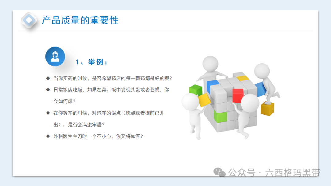 产品质量的重要性在我们的日常生活中,质量无处不在。试想一下,如果战场上士兵使用的枪械出现故障,如果跳伞时降落伞无法打开,如果驾驶的汽车转向失灵,如果购买的月饼中有苍蝇,如果游乐园的过山车存在安全隐患……这些情况的发生,无疑会给人们的生命安全和生活质量带来极大的威胁。而在工作中,我们却常常忽视质量的重要性,持有一种双重标准——生活上追求零缺陷,工作上却马马虎虎。要知道,1%的错误可能导致100%的失败。因此,我们必须深刻认识到产品质量的重要性,将其放在工作的首位。 1%的错误导致100%的失败在工作中,我们常常认为小的缺陷是可以接受的,但这些小缺陷可能会引发连锁反应,最终导致整个项目的失败。例如,一个小小的螺丝没有拧紧,可能会导致整个机器的故障;一个数据输入的错误,可能会导致整个财务报表的不准确。这些例子都告诉我们,质量的每一个细节都至关重要,我们不能忽视任何一个可能影响质量的因素。 质量和质量意识的概念质量意识教育在企业中至关重要,只有当领导层开始重视质量,员工才有可能真正重视起来。那么,什么是质量呢?质量是产品满足客户明确或潜在需要的特性,是产品符合标准要求的特性,也是生产过程管理要求的体现。而质量意识,则是要求我们不仅要保证产品合格,符合规格要求,还要严格遵守企业生产流程的管理规定。作为员工,我们不能仅仅是被动接受,更要积极提出改善意见,促进质量的提高。观念的改变是行动改变的前提,行动的改变又能促使习惯的改变,而习惯的改变最终将影响我们的人生。 产品满足客户的明确或潜在需要质量不仅仅是产品符合技术标准,更重要的是要满足客户的需求。客户的需求是多方面的,包括产品的功能、性能、外观、安全性等。例如,客户购买一台电脑,不仅希望它能够正常运行,还希望它具有良好的散热性能、美观的外观和易于操作的界面。因此,我们在生产过程中,要始终以客户的需求为导向,不断优化产品设计和生产工艺,确保产品能够满足客户的期望。 生产过程的管理要求生产过程的管理同样重要。良好的生产管理可以确保产品质量的稳定性和一致性。这包括5S管理(整理、整顿、清扫、清洁、素养)、交接班注意点、管理制度等。例如,通过5S管理,可以保持工作环境的整洁和有序,减少因环境混乱导致的质量问题;通过严格的交接班制度,可以确保生产信息的准确传递,避免因信息不准确导致的生产错误。因此,我们必须严格遵守企业的生产管理制度,确保每一个生产环节都符合要求。 质量意识的建立质量管理的五不放过原则是我们必须遵循的准则:原因找不到不放过,责任分不清不放过,纠正措施不落实不放过,纠正措施不验证不放过,有效措施不纳入不放过。制造单位过程质量管理的四不政策同样重要:不收不良品,不做不良品,不流不良品,不出不良品。在质量异常处理和不合格品处理流程中,我们要严格按照规定操作,确保每一个环节都不出问题。 质量管理的五不放过原则