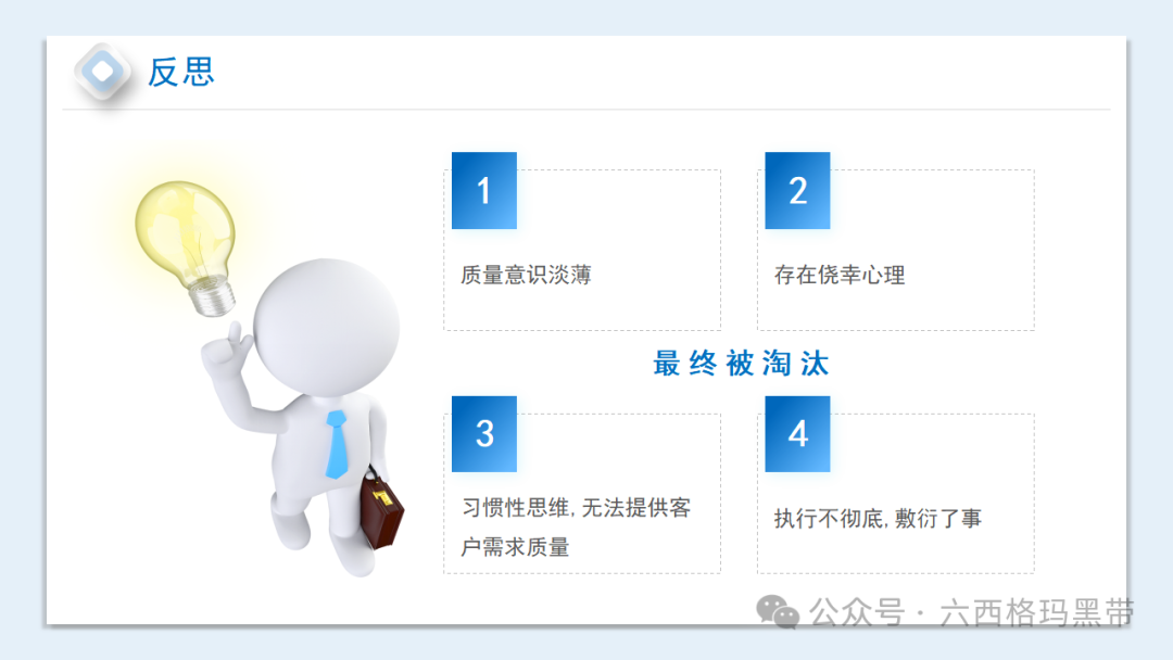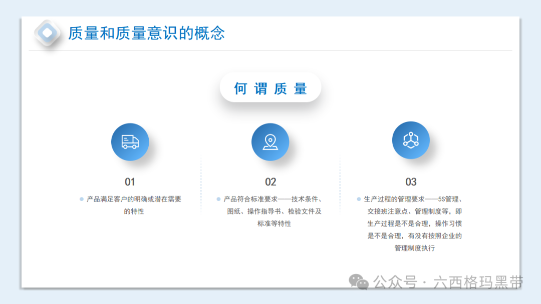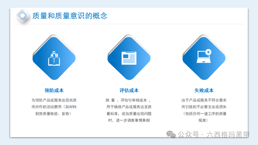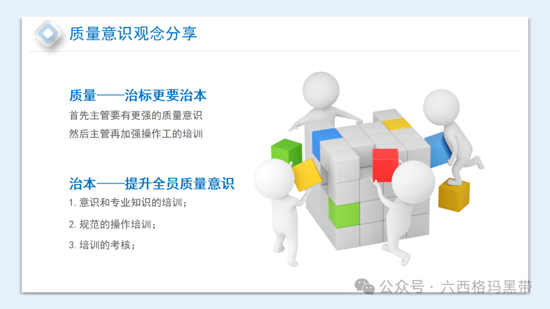 持续改进与质量意识提升质量意识的提升是一个持续的过程,我们需要不断改善,持续改进。不是不愿改进,而是不屑于小的改进。原来的老思想根深蒂固,一时难以适应,但我们必须努力克服,以适应新的质量要求。质量的提升需要治标更要治本,首先主管要有更强的质量意识,然后主管再加强操作工的培训。治本的关键在于提升全员质量意识,包括意识和专业知识的培训、规范的操作培训以及培训的考核。 持续改进的重要性持续改进是质量提升的关键。我们不能满足于现状,而要不断寻找改进的机会。例如,通过定期的质量审核,发现生产过程中的问题,并采取措施进行改进;通过员工的建议和反馈,不断优化生产流程和产品质量。持续改进需要我们全员参与,每一个人都要树立质量意识,积极提出改进建议。 提升全员质量意识