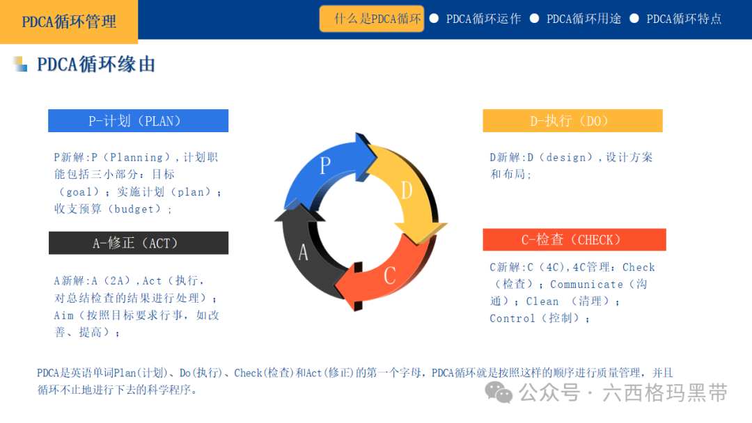 PDCA循环管理概述在现代企业管理与持续改进的实践中,PDCA循环作为一种科学的管理方法,扮演着至关重要的角色。它不仅是一种迭代的过程改进工具,更是一种思维方式,旨在通过循环往复的四个阶段——计划(Plan)、执行(Do)、检查(Check)、修正(Act),推动组织不断向前发展,实现既定目标与愿景。PDCA循环不仅限于质量管理领域,其应用范围已扩展至项目管理、战略规划、个人成长等多个层面,成为推动持续改进和优化的核心机制。 PDCA循环定义起源与发展PDCA循环,常被称作“戴明环”,但实际上,其最初的概念由统计学家沃尔特·休哈特(Walter Shewhart)提出,后来由爱德华·戴明(W. Edwards Deming)博士在日本推广并广泛应用,成为全面质量管理(TQM)的核心工具之一。戴明强调,通过持续的循环反馈过程,可以有效减少变异,提升产品和服务的质量。 四个阶段详解