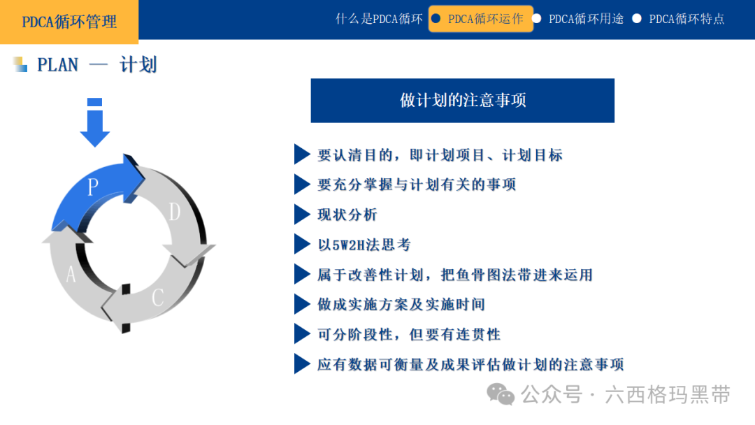 PDCA循环的实践价值持续改进的文化PDCA循环不仅仅是一种管理工具,它更是一种促进组织内部形成持续改进文化的驱动力。通过不断地计划、执行、检查和修正,组织能够培养出一种对现状永不满足、对未来持续探索的态度,鼓励员工主动发现问题、提出改进意见,从而形成一种积极向上的工作氛围。 增强应变能力在快速变化的市场环境中,PDCA循环帮助组织增强了对外部变化的敏感度和响应速度。通过定期的评估和修正,组织能够迅速调整策略,适应新的市场需求或应对突发状况,确保在竞争激烈的环境中保持领先地位。 促进团队协作PDCA循环的实施需要跨部门、跨职能的紧密合作。在计划阶段,团队成员共同参与目标设定和方案制定;在执行阶段,各自承担责任,协同工作;在检查和修正阶段,共同分析成果,分享经验教训。这一过程不仅加强了团队成员之间的沟通与协作,还促进了知识共享和团队凝聚力的提升。 提升决策质量PDCA循环强调基于数据和事实的决策。通过系统的数据收集、分析和反馈,管理者能够更加准确地了解实际情况,做出更加科学、合理的决策。同时,循环过程中的持续学习和经验积累,也为未来的决策提供了宝贵的参考依据。 实现战略目标将PDCA循环应用于战略层面,可以帮助组织将长期愿景分解为短期可实现的目标,并通过持续的循环迭代,逐步逼近并最终实现战略目标。这一过程不仅确保了战略的有效落地,还促进了组织能力的持续提升,为长期发展奠定坚实基础。 做计划的注意事项在PDCA循环中,计划阶段是整个循环的基石,一个周密的计划能够为后续的执行、检查和修正提供清晰的方向和坚实的基础。因此,在制定计划时,需要特别注意以下几个方面: 认清目的首先,必须明确计划的目的,这是计划制定的出发点和归宿。计划项目应紧密围绕组织或个人的长期目标展开,确保每一项计划都是对实现这些目标的有效支撑。同时,计划目标应具体、可量化,以便于后续的跟踪和评估。 充分掌握相关事项在制定计划之前,需要对现状进行全面、深入的分析。这包括了解组织内部的资源状况、能力水平,以及外部环境的机遇与挑战。只有充分掌握相关事项,才能制定出既符合实际又具有前瞻性的计划。 以5W2H法思考5W2H法是一种有效的思考工具,它帮助我们从多个维度审视计划,确保其完整性和可行性。具体来说,就是回答以下问题: