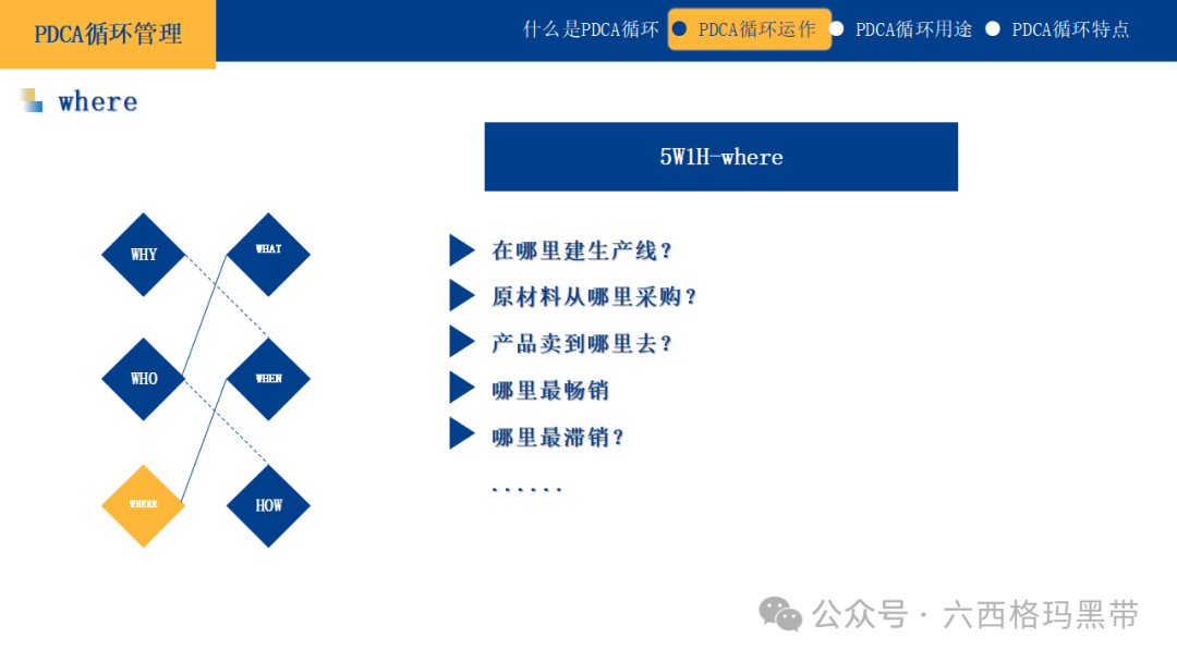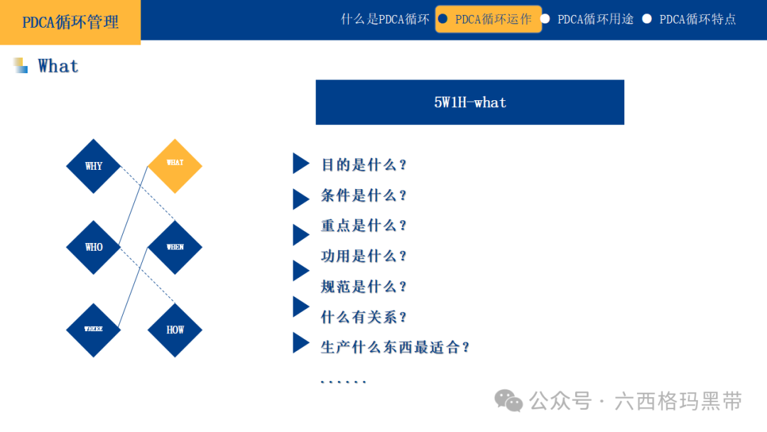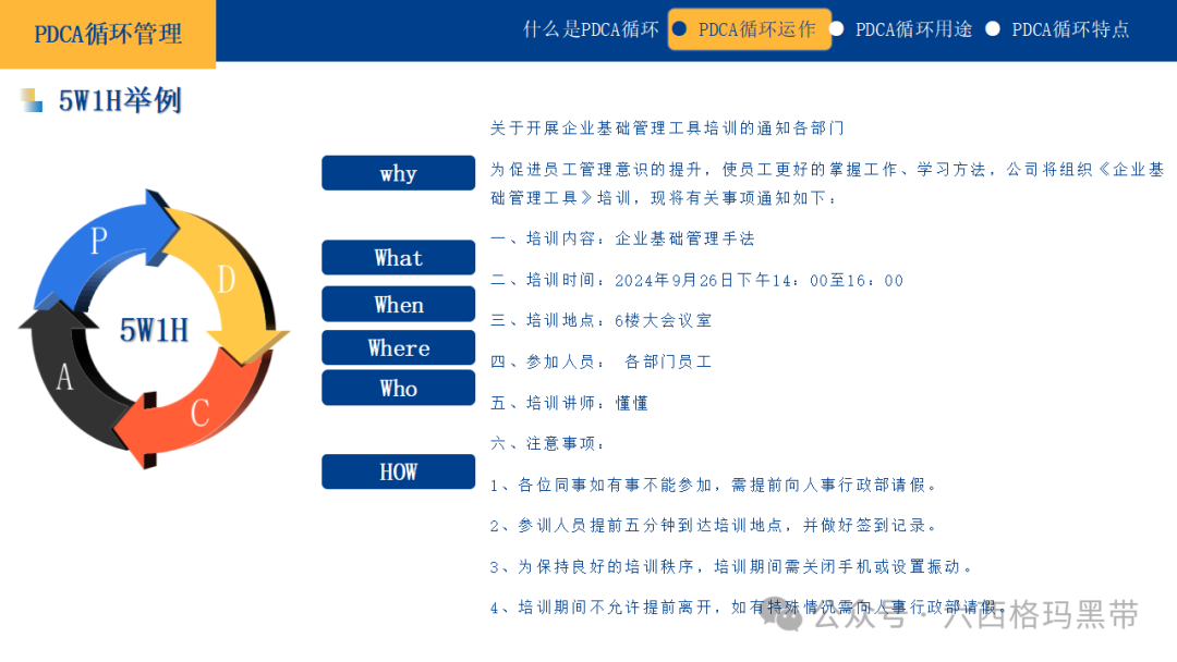 对于改善性计划,可以结合鱼骨图法(因果图法)来进一步分析问题的根源,并制定相应的改善措施。 实施方案及时间计划中的实施方案应具有可操作性和连贯性。可以将大计划分解为若干个小计划或阶段性目标,但每个小计划之间应有逻辑上的联系,共同支撑大计划的实现。同时,应明确每个阶段的时间安排,确保计划能够按时完成。 应有数据可衡量及成果评估计划应包含可量化的指标和成果评估方法。这不仅能够帮助我们在执行过程中跟踪进度,还能在计划结束后对成果进行客观评价。数据化的管理是现代企业管理的重要趋势,它能够使管理更加精准、高效。 思考方法5W1H法5W1H法是一种基本的思考问题和解决问题的方法,它涵盖了问题解决的六个关键方面: