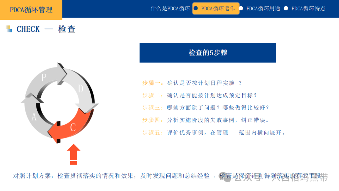 执行(Design)在新解释中,“执行”被赋予了“设计”的含义,强调在执行前进行周密的设计和布局,包括流程优化、资源配置、团队协作机制等,以提高执行效率和效果。 检查(4C管理)