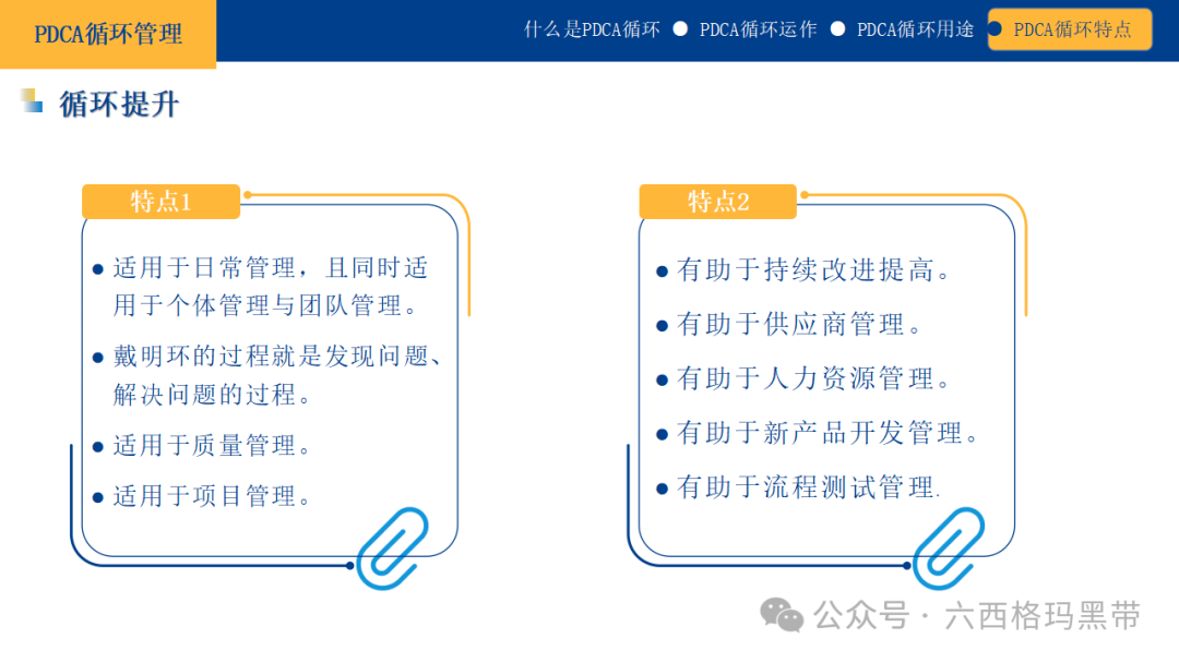 通过5W1H法的系统思考,我们能够更加全面地理解问题,制定出更加有效的解决方案。 因果图法(鱼骨图)因果图法,又称鱼骨图法,是一种用于分析结果与影响因素之间关系的工具。它通过将问题的主要原因(即“鱼头”)和次要原因(即“鱼骨”)以图形化的方式呈现出来,帮助我们直观地识别问题的根源,并找到解决问题的措施。鱼骨图法常用于质量管理、故障分析、项目管理等领域,是PDCA循环中检查阶段的重要工具之一。 PDCA循环的特点PDCA循环作为一种科学的管理方法,具有以下几个显著的特点: 大环套小环PDCA循环是一个层级结构,大循环中可以包含多个小循环。每个小循环都是一个完整的PDCA过程,它们相互独立,但又服务于大循环的目标。这种层级结构使得PDCA循环能够灵活地应用于不同层级的管理活动中,从组织战略到具体任务,都可以找到合适的循环层级。 小环保大环在PDCA循环中,小循环的成功是实现大循环目标的基础。每个小循环都应对其所在的大循环负责,确保其活动与大循环的目标保持一致。通过不断地优化小循环,可以推动大循环的持续改进和提升。 互相促进PDCA循环的各个阶段不是孤立的,而是相互关联、相互促进的。计划阶段为执行阶段提供了方向和依据;执行阶段将计划转化为实际行动;检查阶段对执行结果进行评估和反馈;修正阶段则根据反馈对计划进行调整和优化。这四个阶段形成一个闭环系统,共同推动组织的持续改进和发展。 推动大循环PDCA循环的最终目的是通过不断的迭代和改进,推动整个组织或项目的大循环向前发展。每一个小循环的完成,都是对大循环目标的一次逼近。随着PDCA循环的不断进行,组织能够逐步积累经验,优化流程,提升能力,最终实现战略目标和持续发展。
