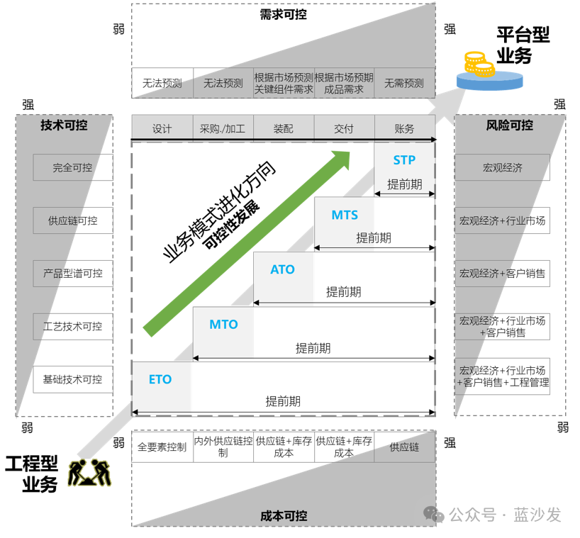 上文从计划模式角度分析四个要素:需求模式、技术模式、成本模式、产能模式,本文将分析视角提高到业务经营层次,对此分析四个业务要素/指标的可控性,分别是需求可控性、技术可控性、成本可控性、风险可控性,最后总结业务进化的宏观轨迹。 基于这个思路 ,五种模式不再称为计划模式,而是称为业务模式,并对其中两种模式的名称做了调整,一是将ETO称为按订单工程,二是将PTP改为STP按计划服务,并对STP模式的内涵做了扩展。 需求可控—指的是对最终成品技术要求的控制。 技术可控—指的是对生产和交付产品的技术与工艺的控制。 成本可控—对于来自市场、客户、可变技术要素等成本影响因素的控制。 风险可控—指的是对业务可持续风险的控制。 ETO:按订单工程 典型行业:建造业,如海工设备(海上钻井平台)、大型造船、大型运输设备(如高铁)、能源设施(电厂化工厂)、交通系统(如地铁)、初入行的软件开发企业,咨询服务行业。 需求可控性:无法控制客户对于成品的技术需求,每个项目工程需要在合同之外单独订立技术协议,详细写明对产品及其相关的要求条款,但任何工程项目都有行业标准(比如核电设施工程标准)和模块化单元,企业通过标准依循、模块化单元的自主选择应用及其在售前的推介可以适当扩大对需求的控制。 技术可控性:只能对工程相关的基础技术做出控制,或者对工程所需的部分零部件技术(比如地铁控制系统中的控制模块)予以控制。工程类项目如果只做总包,技术方面只需控制交付标准,交付时只需控制供方资源,对于资源的控制属于成本可控范畴。 成本可控性:需要对工程项目的全要素(供方资源、合同价格、己方资源投入等)成本予以项目全周期控制,所有这些都大量受到外部因素的影响 风险可控性:ETO企业的风险首先来自工程项目本身,由于工程耗资巨大,工程周期和付款周期都长,单个工程项目不利便可导致资金链断裂,因此ETO项目发展出了多种风险控制手段,典型的如付款周期(分多次项目付款,甚至包括首付款)。 发展方向与措施: 方向:向MTO和ATO方向发展。 措施: 遵循行业技术标准,开发积累标准化工程技术组件,制定标准工程路线,如果是头部企业,寻求建立自主产权的标准(比如中国的电力工程、高铁工程、核电工程标准),实现行业技术垄断,为基于标准化技术标准向MTO模式甚至基于标准化模块向ATO模式演进建立基础。 补充: 中国制造的2025已近尾声,据说政府的下一步计划是发展中国工程标准,在中国领先的ETO业务领域(电力、高铁、核电、太阳能等)实现对标准的掌控。 MTO:按订单制造 典型行业:高价值工业品,如生产设备、农用矿用建筑机械、商用车辆。 需求可控性:难以控制对最终成品的技术要求,但相比于ETO模式,MTO模式下的技术标准较为详尽,生产制造工艺成熟完善,因此能据此引导客户方对需求的定义。 技术可控性:需求可控制是以技术可控性为基础,相比于ETO,MTO模式实现了对所有零部件工艺技术的控制(除去外包部分)。 成本可控性:由于完成了所有技术环节与零部件技术工艺标准的控制,成本控制的要点在于通过外部供应链的掌控压缩采购和物流成本,通过内部物流和工艺的优化压缩作业成本,与ETO相比,CBS(成本结构树)结构更加清晰完善,成本发生的过程轨迹和控制策略也更加稳定,成本管理渐渐趋近于对封闭供应链系统的管理(需要通过供应链管理优化此封闭系统)。 风险可控性:MTO业务的风险主要在于外部关系,一是是否能通过营销手段获取稳定的订单,二是能否通过供应链管理消除供应风险并压缩成本,与ETO相比,由于通过供应管理的优化将业务风险分散到了整个行业,来自内部过程的风险已大大降低。 发展方向与措施: 方向:向ATO方向发展。 措施: 通过强化优化产品体系管理,最大化提高通用件比例,压缩产品全生命周期(技术开发、产品技术管理、供应链管理、制造、服务)成本,同时,通过有效的市场营销与客户关系管理增强对市场的预期,并以此提高通用件预生产库存,大幅缩短交付周期。另外,通用件的大批量预生产可以通过精益车间模式大幅提高生产效率(压缩单件成本)和质量。 补充: 产品管理是重点! 多年前思科就有统计,每增加一个元器件,产品全寿期成本就会增加15万美元。 供应链体系是设计出来的,不是采购部自个儿捣鼓出来的。 如果产品管理不当,MTO企业不仅无法向ATO发展,甚至会退化为ETO企业,上海龙旗作为大型手机代工企业,曾在其业务发展高峰期砍掉了大量不挣钱的非洲定制化小订单,就是为了向ATO模式迈进,与之相比,国内一些装备型企业却因为产品管理意识缺失导致大量的订单都是ETO订单,致使其业务利润降到了3%以下(低于国内制造业利润率平均水平)。 从PLM视角看,产品管理有个重要的技术指标,就是全部零部件编码数量与产品零部件总数的比值,优秀的企业(比如苹果)可以做到5:1以下,但国内一些装备型企业因为行业特性原因只能徘徊在20:1左右,由此导致巨量的库存积压。 ATO:按订单装备 技术可控性:相比于MTO,通过产品标准化管理已经发展出通用核心部组件,形成针对客户需求可配置的产品型谱系列,最终配置要求留给客户决定。 成本可控性:供应链和内部预生产置于自主计划驱动下,通用件的计划生产模式进一步提高了效率,基于通用件的装配作业灵活且标准化,成本的控制要