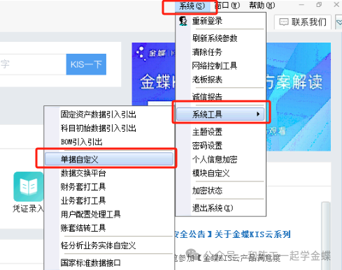 金蝶专业版功能确实强大,基本上能满足我们的要求,但有些单据上我们还想加一些内容,可以加吗?怎么加呢? 可以的,这个就是我们系统的单据自定义,可以对已有单据加自己一些想要体现的内容,但是系统默认的字段不能去删除或者修改。 金蝶公司根据一般企业对供应链系统单据的要求和格式,制定了一套适合大众化的单据模板,用户可以直接使用。但是在实际使用过程中,对于特殊的企业或业务需要制定专门的符合该企业或业务的单据形式,那么这时候就可以利用单据自定义工具在已有单据上来定义个性化设置 登录软件进来,右上角系统下面的系统工具-单据自定义