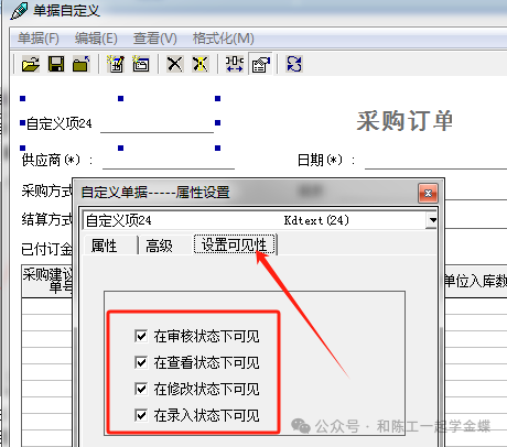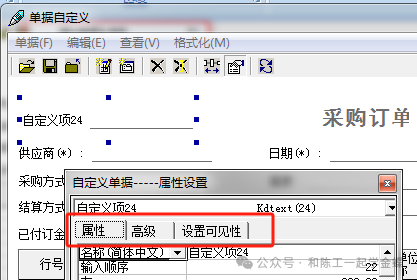 点击编辑→增加单据头字段,在左上角即可看见有一个自定义项24, 点中自定义项24右击属性,弹出自定义单据-属性设置 界面, 在自定义单据-属性设置 下有属性、高级、设置可见 三个页签