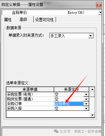 2.6 来源单据:比如刚才采购订单设置了自定义字段24后,在采购入库单就可以设置自定义字段取数来源于采购订单的自定义字段24的内容,这样采购入库就与采购订单一一关联对应了