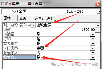 含税金额:名称修改为含税金额,字段类型选择金额,需要合计选择是,高级里面单据录入时来源选择通过公式得到,设置含税金额=实收数量*含税单价