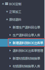 1. 进入ERP系统之后,在左侧功能菜单里找到“BOE定制”,点开“原材退料”,找到“新增退料到BOE出库单