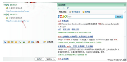 漏洞链接:腾讯QQ某控件设计缺陷导致可远程登录任意QQ账号(已证明QQ空间、相册、微博、邮箱可登陆) 附加说明:此漏洞中所述利用方式,是利用IE来加载tencent://协议,实际上是可以直接在QQ聊天窗口通过点歌的方式来进行利用的,此外当时QQ客户端上的微博播放音乐也在此漏洞利用之列。 场景4: QQ消息篇之搜索一下 分享SOSO搜索结果的这个功能用的人不太多,但是该漏洞细节还是十分有意思的,有没有想过,点击聊天窗口里的一个链接,cookies就会被偷偷以QQ消息的形式发送给黑客?这样的事情确实出现过!