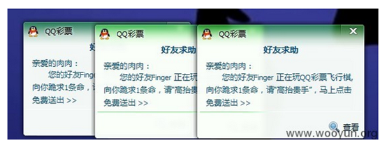 漏洞链接:网络尖刀安全团队研究发现QQ客户端存储XSS,可劫持用户! 漏洞链接:腾讯QQ群持久xss攻击(可执行js窃取cookie挂马等已经有人利用) 附加说明:两个链接为同一漏洞,前者先向TSRC报告,后漏洞流出,被发至乌云平台。 场景6: QQ右下角弹窗篇之消息轰炸 如果有一天,你的QQ一直弹出下来这样的消息,会不会有一丝丝蛋疼(女性除外)。