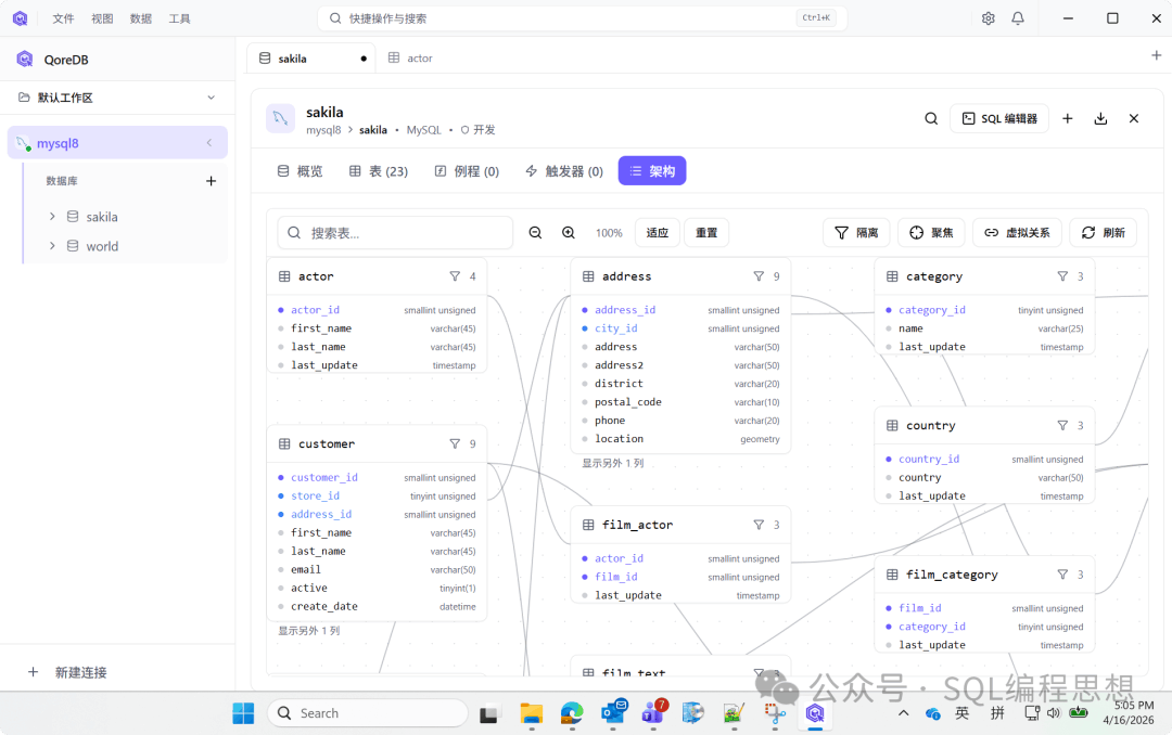 - • 交互式 ER 图:提供实时 schema 浏览,表与关系可视化,支持缩放、平移、搜索,点击关系直接查看数据。