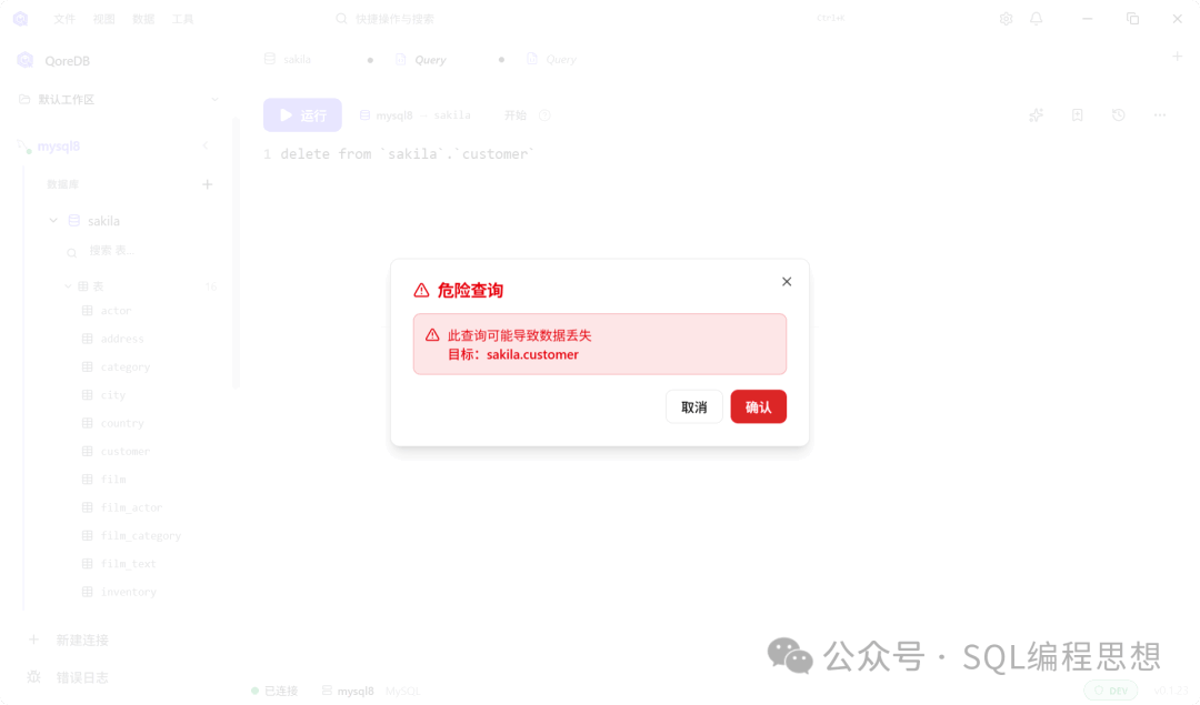 - • 查询安全机制:QoreDB 内置通用查询安全机制,自动检测高风险 SQL 并且根据环境(开发/预发布/生产)发出不同级别的警告,主动防止误操作;同时对于敏感操作记录本地审计日志。