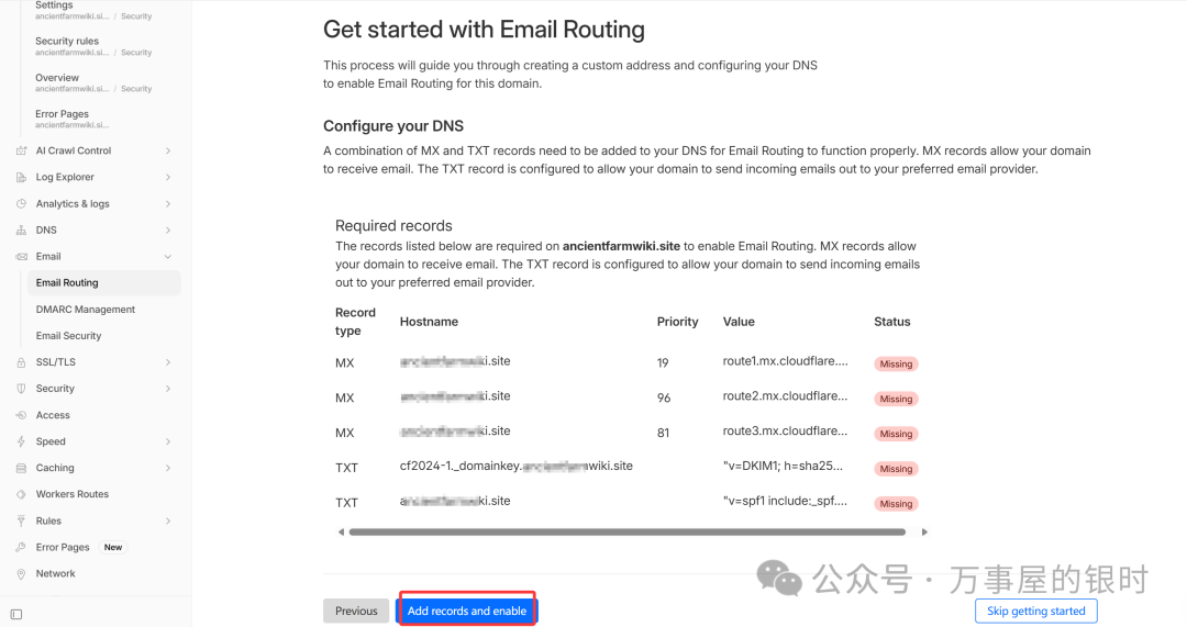 首次进入点「开始使用」,Cloudflare 会引导你完成配置,自动添加必要的 MX 和 TXT 记录,不需要手动操作 DNS。