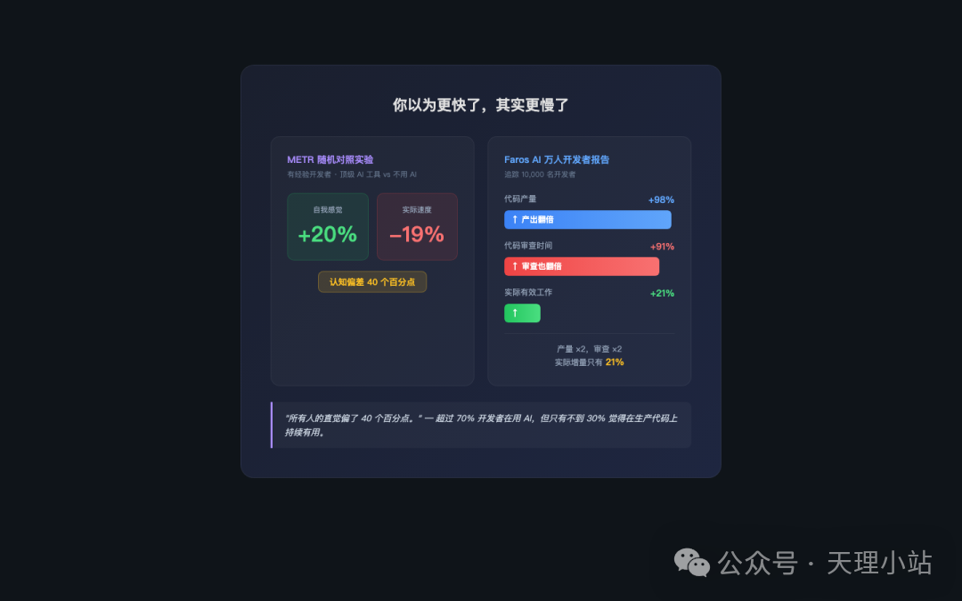 100 小时那个帖子里也有人总结:"他停止用 prompt 直接写代码、打开 Figma 开始真正设计的那一刻,Claude 的实现质量飞跃了。瓶颈从来不是代码生成,是在生成之前就该发生的思考。" HN 上另一个很好的做法来自 citizenkeen:"我们团队都用 Claude,但我有一条严格规定:我们不说'我问了 Claude'。用可以,但你必须为产出负责。" 高效使用 AI 编程的人有一个共同点:他们把 80% 的时间花在 AI 动手之前。 七、你以为你更快了,其实更慢了METR 做过一个随机对照实验:让有经验的开发者分两组,一组用顶级 AI 编程工具,一组不用。 结果:用 AI 的那组反而慢了 19%。 更扎心的:同一批人自我评估觉得自己快了 20%。 所有人的直觉偏了 40 个百分点。 Stack Overflow 2025 年调查也印证了这一点:超过 70% 的开发者在用 AI 工具,但只有不到 30% 觉得它在生产代码上持续有用。66% 的人经历了"生产力税"——AI 省下的时间,被审查和修正吃回去了。 Faros AI 追踪 10,000 名开发者给出了更精确的数字:用 AI 的团队代码产量增加 98%——但代码审查时间也增加了 91%。最终实际多完成的有效工作?只有 21%。