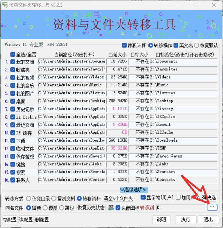 01 聊一聊 今天给大家分享一款文件夹转移工具。 附件:Windows系统资料文件夹转移工具V5.2.3.rar 02 软件介绍 这是一款绿色单文件小工具,体积仅有 548K,非常小巧轻便。 它可以一键将「我的文档」「收藏夹」「我的视频」「我的音乐」「桌面」「临时文件」等系统目录,转移到非系统盘。 ![]() 默认会转移到 D 盘,如果你想换到其他盘,点击右下角的三点按钮,选择目标文件夹即可修改。 ![]() 工具提供三种转移方式:仅变目录、复制资料、转移资料。 「仅变目录」只修改文件夹的链接指向,「复制资料」会在新位置复制一份,原文件保留不删除。 ![]() 转移完成后,会显示完整的文件转移信息。 ![]() 该文章在 2026/4/24 10:57:56 编辑过 |