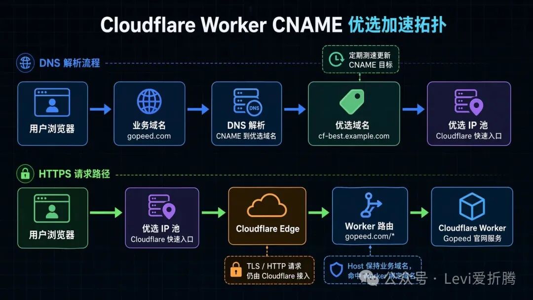 整个链路大概是下面这样,业务域名通过 CNAME 指向优选域名,优选域名再解析到当前质量更好的 Cloudflare 入口 IP,最终请求仍然由 Cloudflare Edge 接入并命中 Worker 路由。