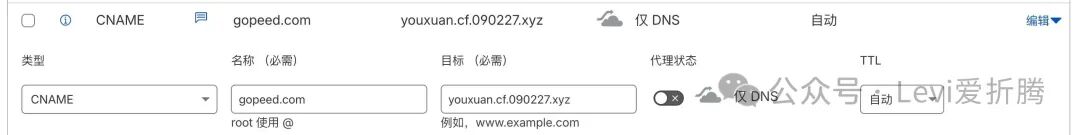 到域名的 DNS 管理处,把业务域名的解析从原来的 A 记录改为 CNAME,指向前面提到的优选域名,记得不要开启小黄云。