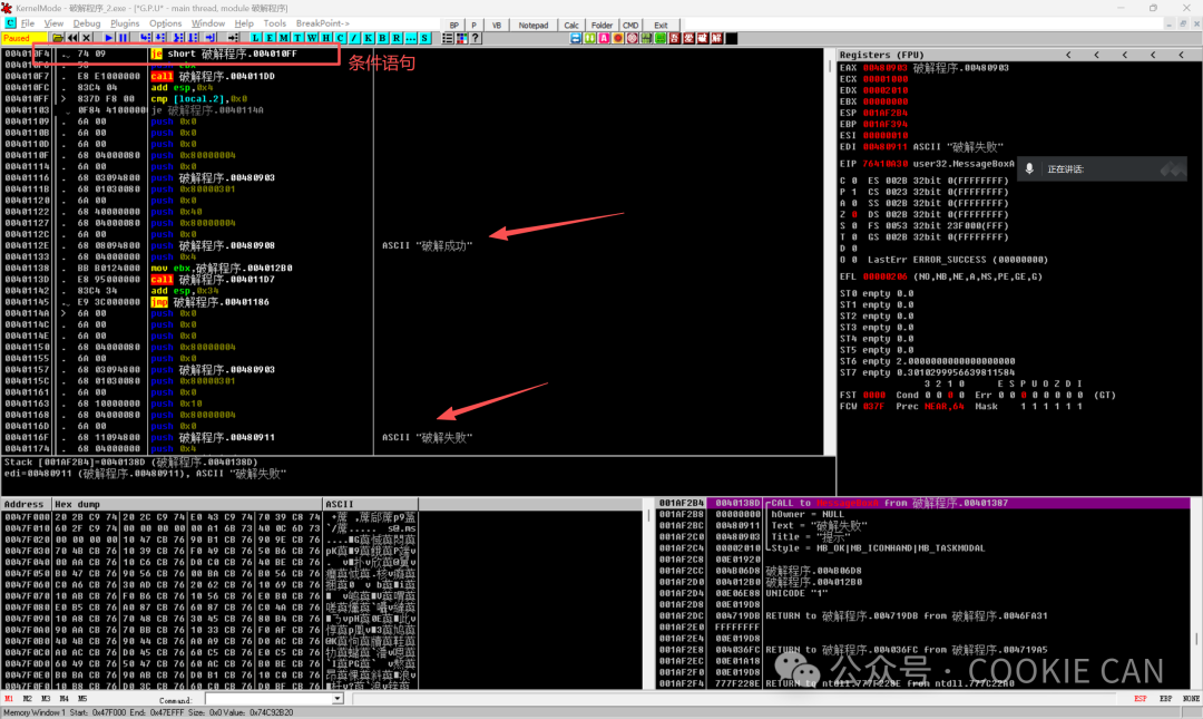 MessageBoxA是 Windows 提供的一个系统函数,用来专门调用一些错误和正确的提示窗口,直接说可能不是很明白,但是看下图你就明白了:学习这个系统函数是因为我们观察到,弹出的错误弹框正是调用了这个函数,那么我们不就有思路了吗,在这个函数这里下断点,那么往回跟一定就是判断关键验证点的地方啊!!!首先把软件拖入od(Olly Dbg)中,一进来是这个界面,注意点在什么地方:还记得刚学的MessageBoxA吗,按住ctrl+G,直接搜索这个,定位到这个点后可以在这加上个注释(按一下;可添加messageboxa注释)按F8一步步走下去直到把程序运行出来,然后观察是哪个点触发了弹窗函数,按F2下断点在这里:然后随便输入一个数字,点击按钮后程序就来到了我们下的MessageBoxA这个断点处,此时注意观察栈的地址(右下角),程序进入错误弹窗的分支(准备弹出错误提示)001AF2B4 0040138D /CALL to MessageBoxA from 破解程序.00401387