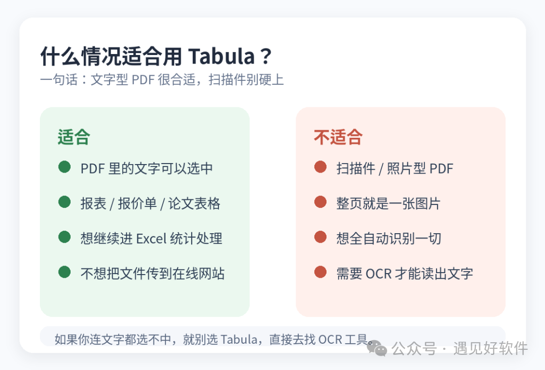 ⚠️ 如果你处理的主要是截图、照片、扫描版 PDF,那应该去找 OCR 工具,不该选 Tabula。