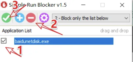 把百度网盘拖进软件里,再点击绿色的 ✅ 按钮,程序就会被禁止运行。