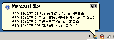 1、用户不需要长期打开点晴MIS系统WEB页面,有新信息时(通知、会议、WEB端短信通新信息、工作流提醒、审批、工作联络单、Email、ERP异常订单、订单审批等所有新信息),点晴MIS短信通会主动弹出窗口提醒用户,用户点击后可以立即查看并处理新信息;