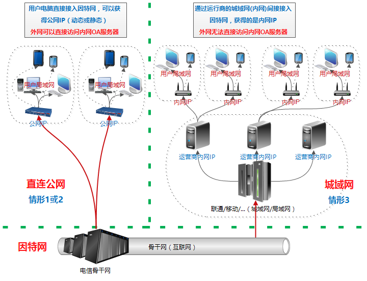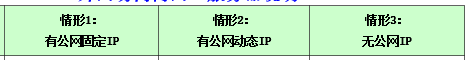 OA服务器所在 局域网状态 | 情形1: 有公网固定IP | 情形2: 有公网动态IP | 情形3: 无公网IP |