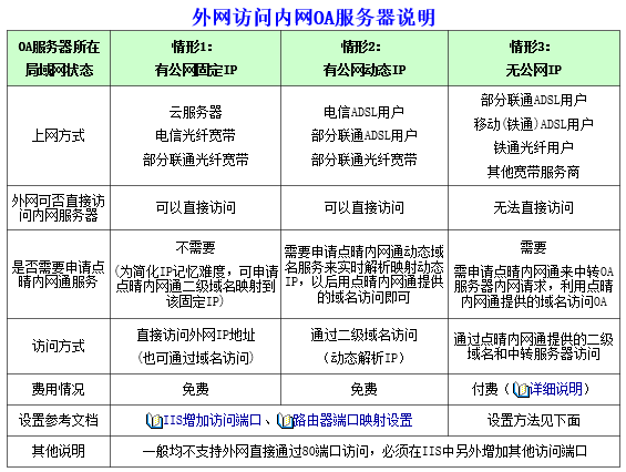 | 是否需要申请点晴内网通服务 | 不需要 (为简化IP记忆难度,可申请点晴内网通二级域名映射到该固定IP) | 需要申请花生壳或点晴内网通动态域名服务来实时解析映射动态IP,以后用该域名访问即可 | 需要 需申请点晴内网通来中转OA服务器内网请求,利用点晴内网通提供的域名访问OA |