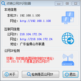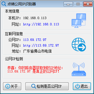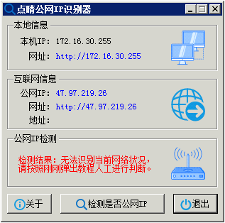 点晴公网IP识别器,点击按钮“检测是否公网IP”,会看到三种不同的提示: