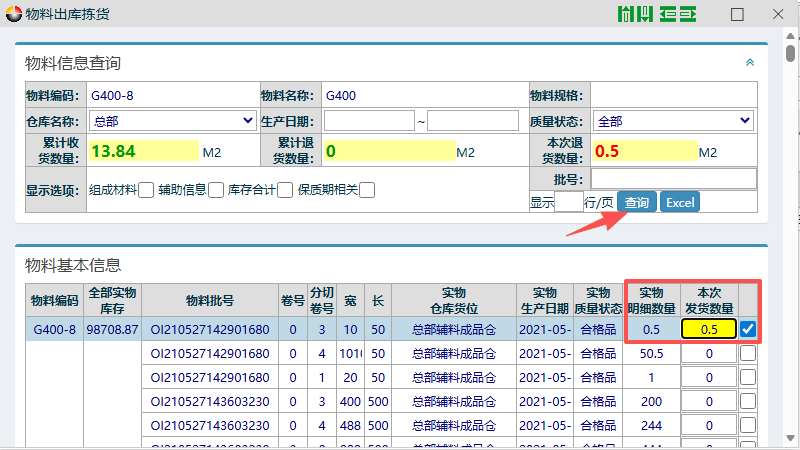 点击选择对应的入库单信息,然后再点击“出库”按钮