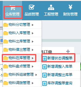 操作步骤:仓库管理——物料在库管理——新增状态调整单;进入页面后如下图所示: