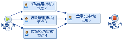 点晴OA工作流中实现串行单人审核、多人并行会审、并行单人单审和条件跳转审核描述如下:、串行单审:说明:各个审核节点依次逐级进行,每个节点上只能设置了一个审核岗位或审核人,审核过程中任意一个节点审核通不过被驳回,就不再进行到下一个节点了。图例: