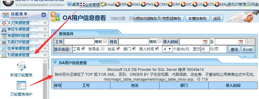 请问工作流和万能魔表两个管理模块的自定义SQL数据源如何实现排序效果?现在总是报错80040e14,除非另外还指定了TOP或FORXML,否则ORDERBY子句在视图、内联函数、派生表、子查询和公用表表达式中无效。这个提示很清楚,就是自定义的SQL语句有语法错误,当在自定义的SQL中使用了orderby自定义排序时,...