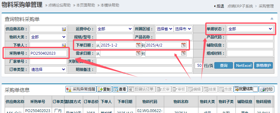 反审核操作步骤:采购管理——采购单管理——采购单明细管理,进入页面如下图所示:注意事项:如果订单中有已经结案的明细项目,那么这张订单是不允许反审驳回的。像下面这张单一共6个物料,只有一个还在“已审待执行”状态,其余均已结案,那么这张单是不允许反审驳回的,只能将有问题的物料行异常结案关闭,重新下单。另外,查询时注意查询条...