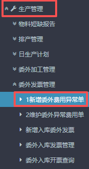 进入ERP系统之后,在左侧的功能菜单里找到“生产管理”,点开“委外发票管理”,点击“新增委外费用异常单”。