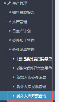 进入ERP系统之后,在左侧的功能菜单里找到“生产管理”,点开“委外发票管理”,点击“委外入库开票查询”。
