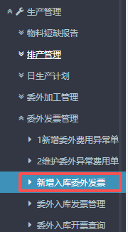 进入ERP系统之后,在左侧的功能菜单里找到“生产管理”,点开“委外发票管理”,点击“新增入库委外发票”。