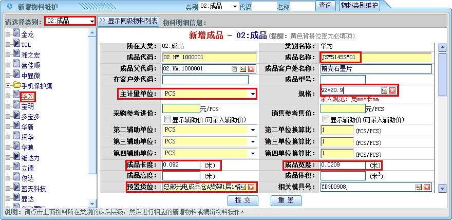 2.必填信息有:成品名称;主计量单位;规格;预制货位。