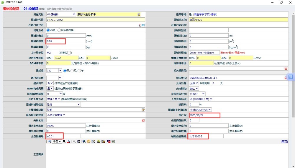 答:针对这个问题可以先在“系统管理”》“物料信息维护”中找到对应物料,然后对物料信息进行编辑,如:物料厚度、主条码编号和服辅助条编码进行修改。