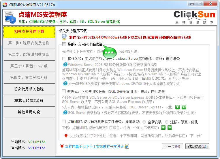 程序说明:点晴MIS系统安装程序可以:1、安装全新点晴MIS系统;2、修复已经安装完毕但出错的点晴MIS系统;3、迁移点晴MIS系统到其他电脑;4、优化点晴MIS系统的IIS和SQLServer相关参数。本程序是基于此手工安装点晴MIS系统教程而开发的辅助程序:http://4476.oa22.cn