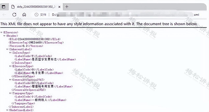 XML不同于PDF和OFD,形式上只是一串代码,记录发票的全部元数据,其样式 如下: