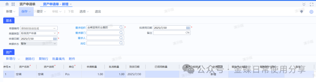 【操作说明】:资产需求采购部门在系统中创建资产申请单,填写需求组织及部门、所需资产物料(物料属性为资产),数量及到货日期并提交审核。