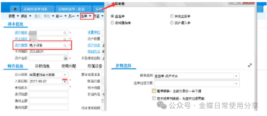 【操作说明】:当需求人员做了资产申请单的情况下,首先调整采购申请单的单据类型为资产采购申请单,再通过选单的方式创建采购申请单,选择采购组织、录入推荐供应商(可选)提交审核。